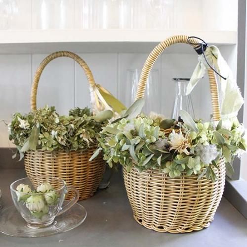 カゴのふちにドライフラワーをワイヤーで止めて... 素敵な花籠もおすすめです。