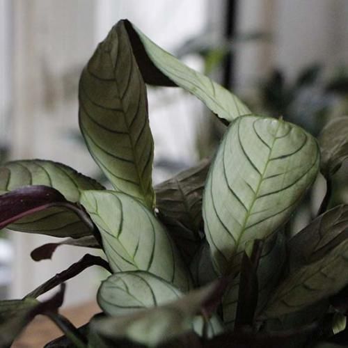 アマグリスの葉は独特な形状を持ち特徴的です。鋭い先端とツヤツヤとした表面が美しく、光に当たると葉のグリーンが一層鮮やかに輝きます。葉の裏側は紫色がかった色合いで、裏表で異なる色が楽しめる点も魅力的です。