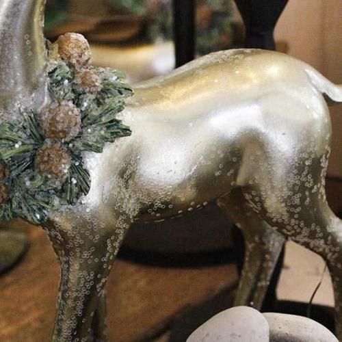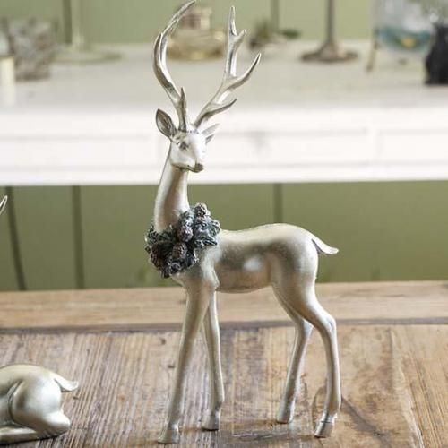 緑のモミのリースをつけた美しい銀色の鹿の立像は、魅力的なディテールです。ニュートラルな雰囲気にも、カラフルな雰囲気にもぴったりです。テーブル、本棚、窓辺、ドレッサーなど、どんな場所にも素敵に飾れます。